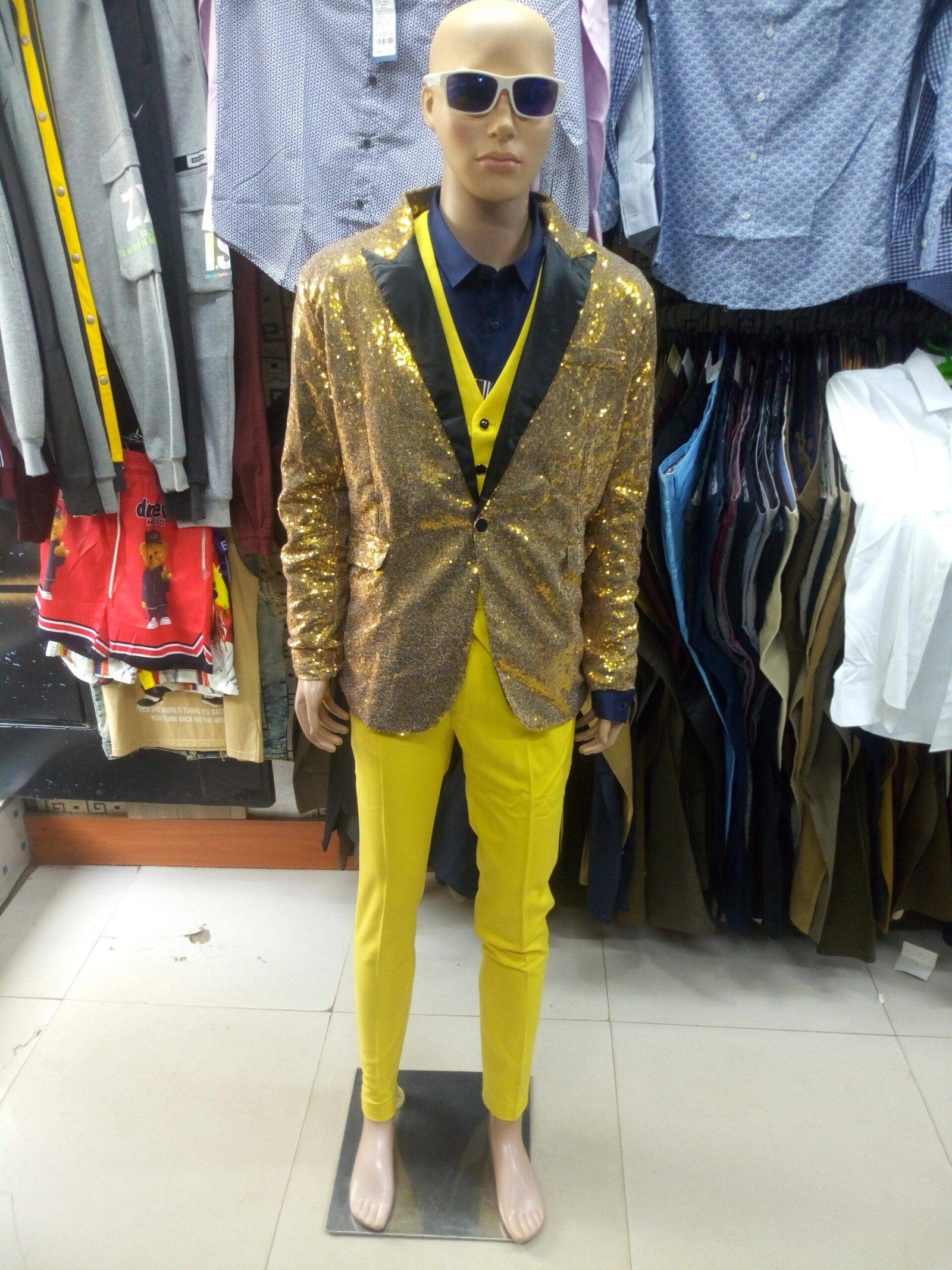 Price range: $25,587.00 through $38,445.00GOLD SHINY GLITTERING TUXEDO COAT FOR MEN