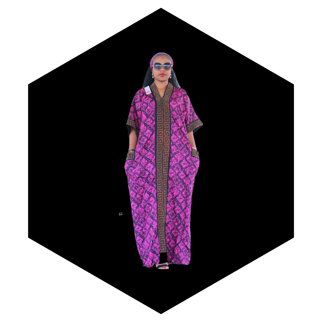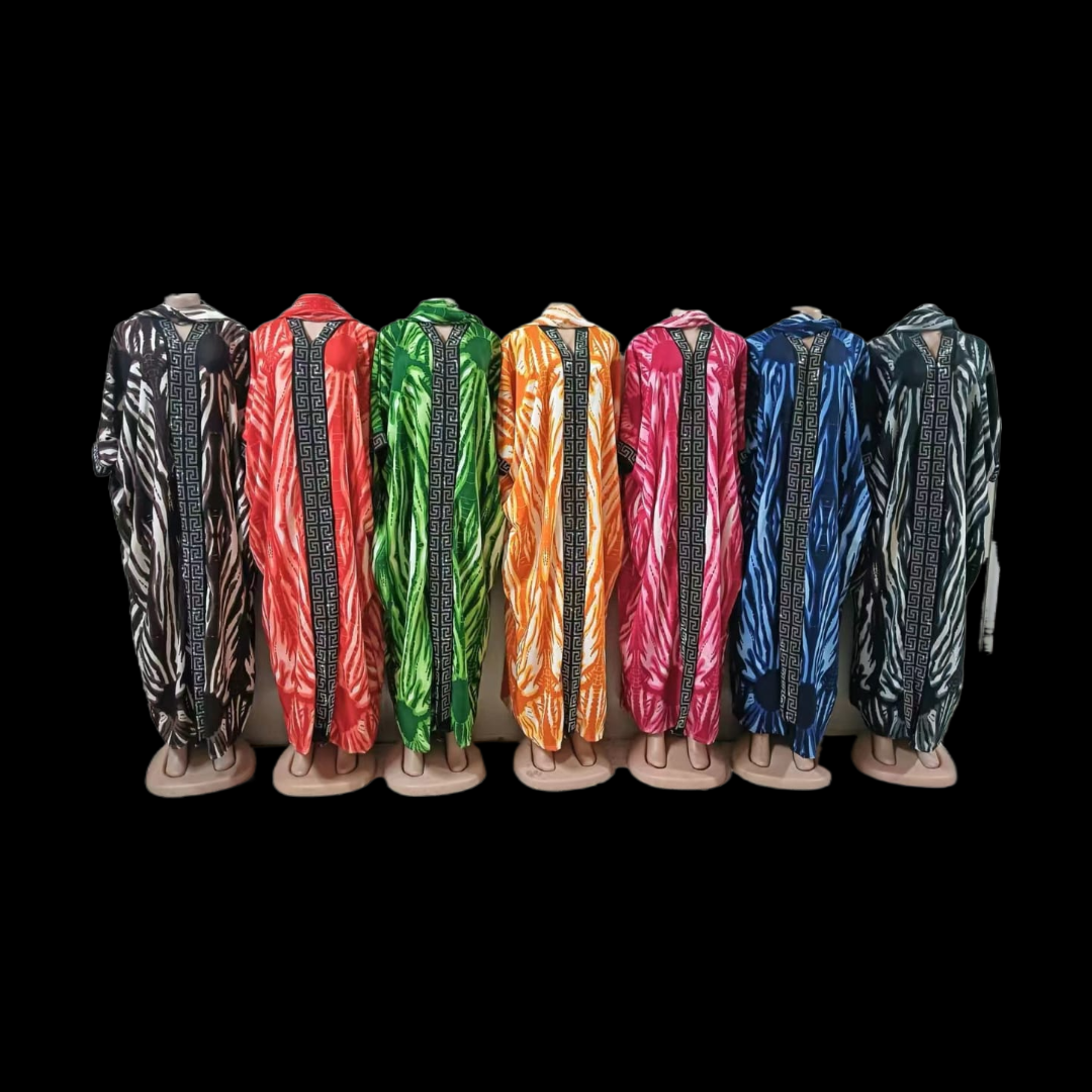 The dress is adorned with vibrant Ankara prints, showcasing an intricate blend of colors and patterns. Crafted from high-quality fabric, it drapes elegantly while allowing freedom of movement. Its loose-fitting kaftan style ensures maximum comfort, making it a wardrobe essential for women who value both fashion and cultural expression.
