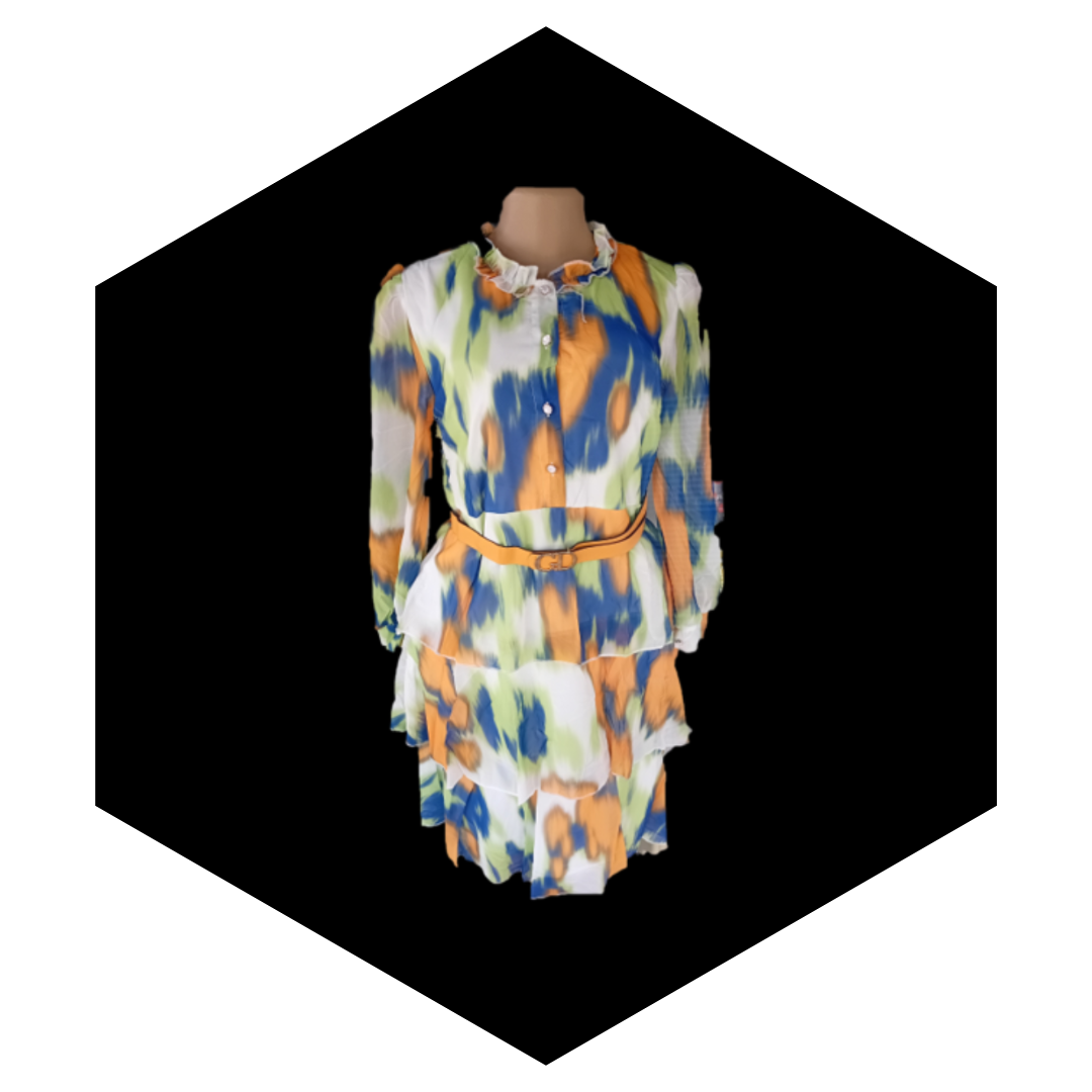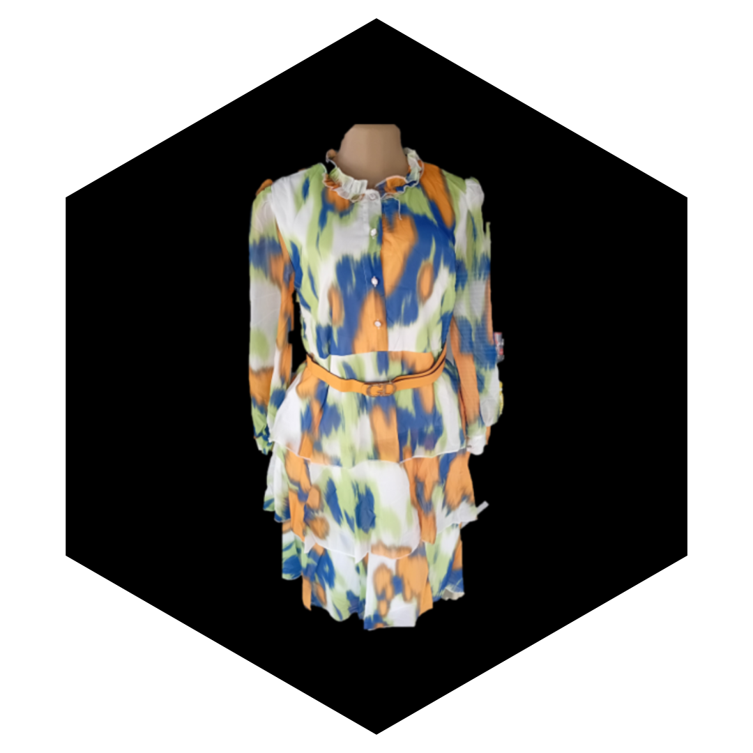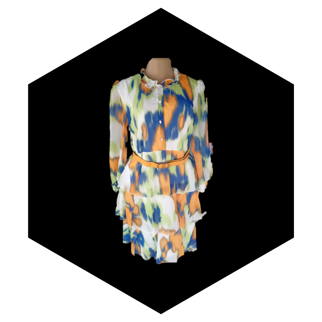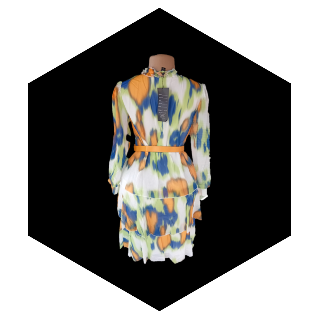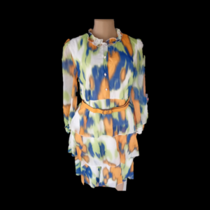 The dress features a vibrant, artistic abstract print that often blends various colors, creating a unique, eye-catching, and, in some cases, watercolor effect.